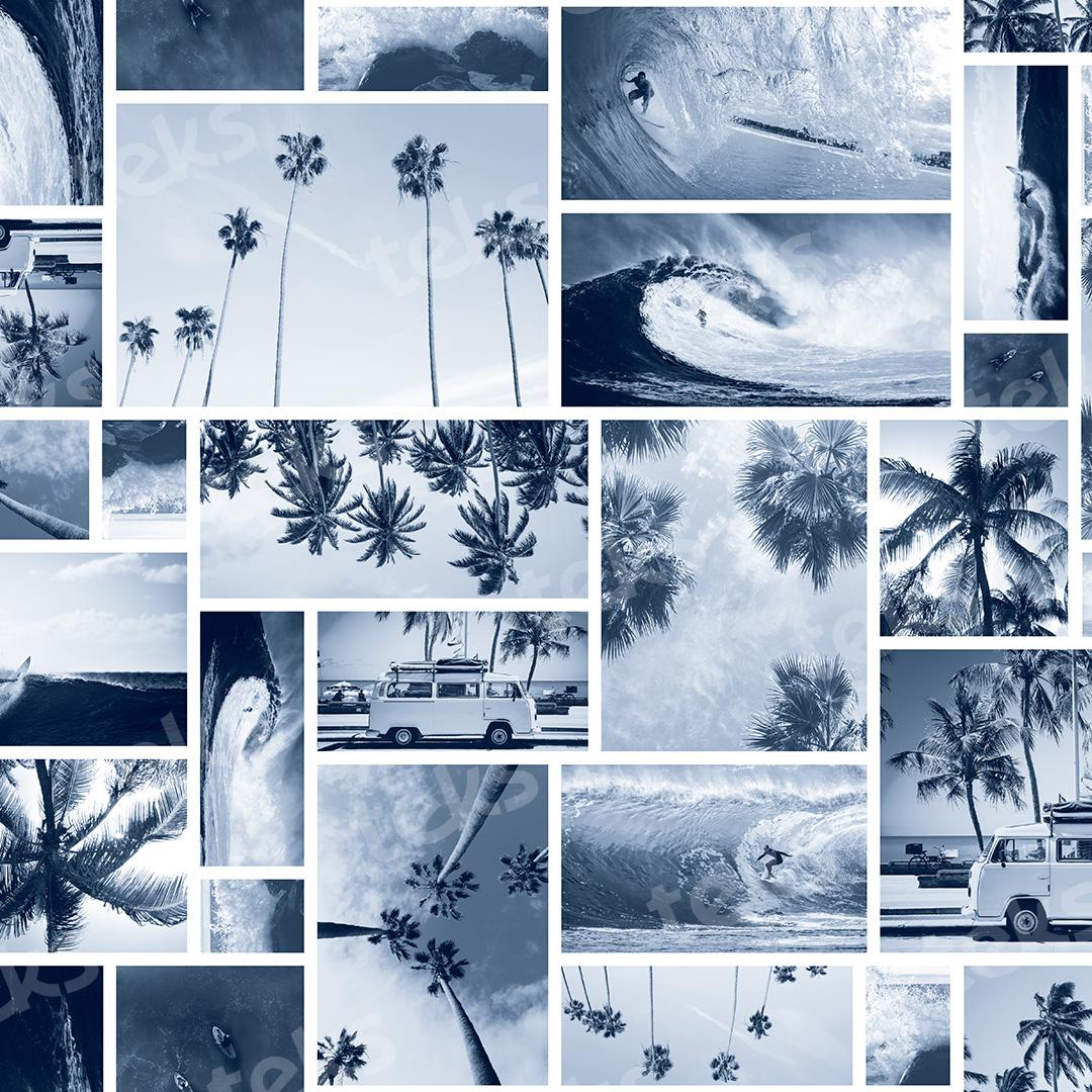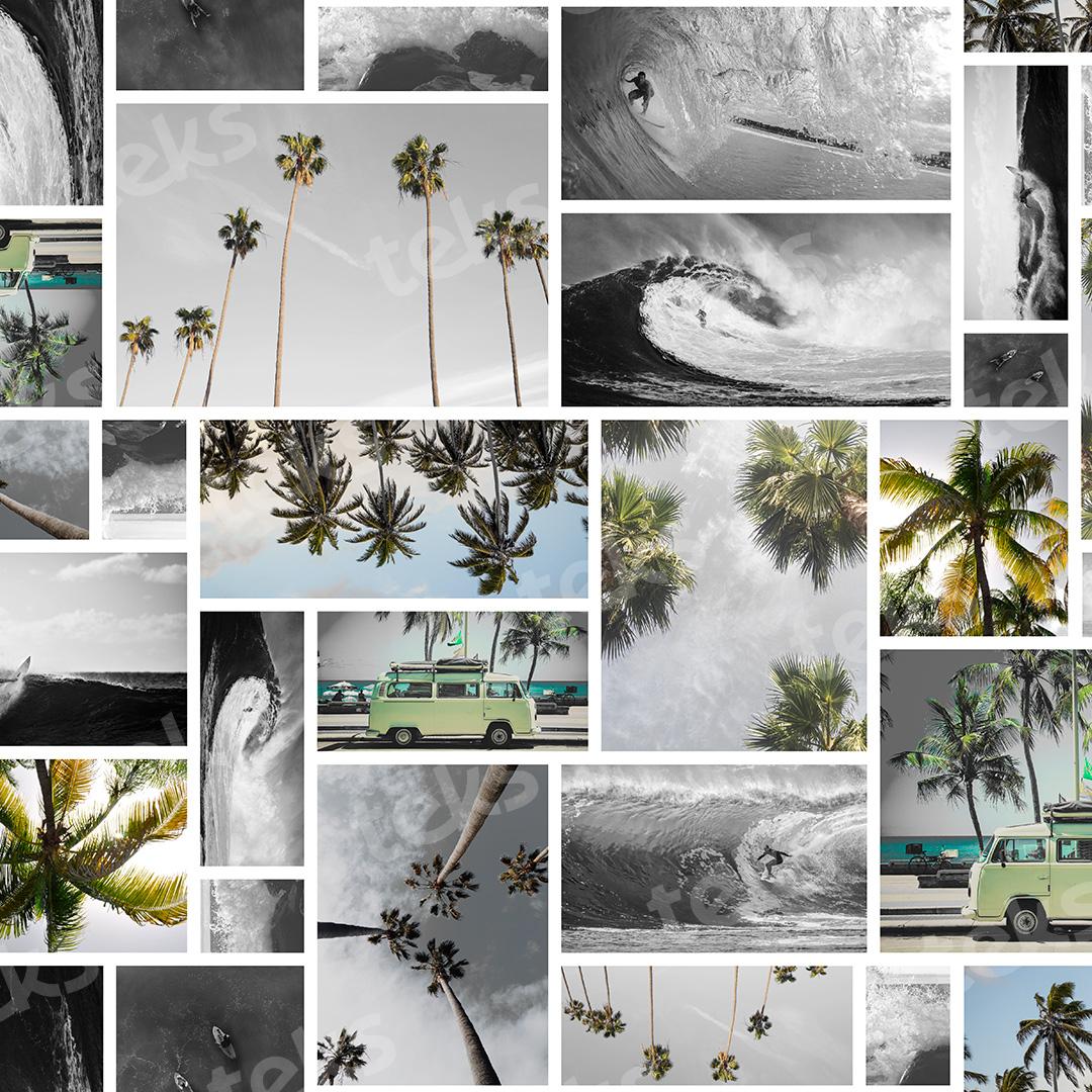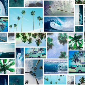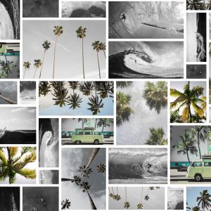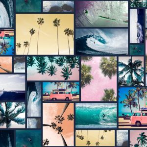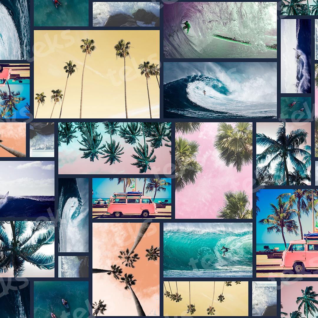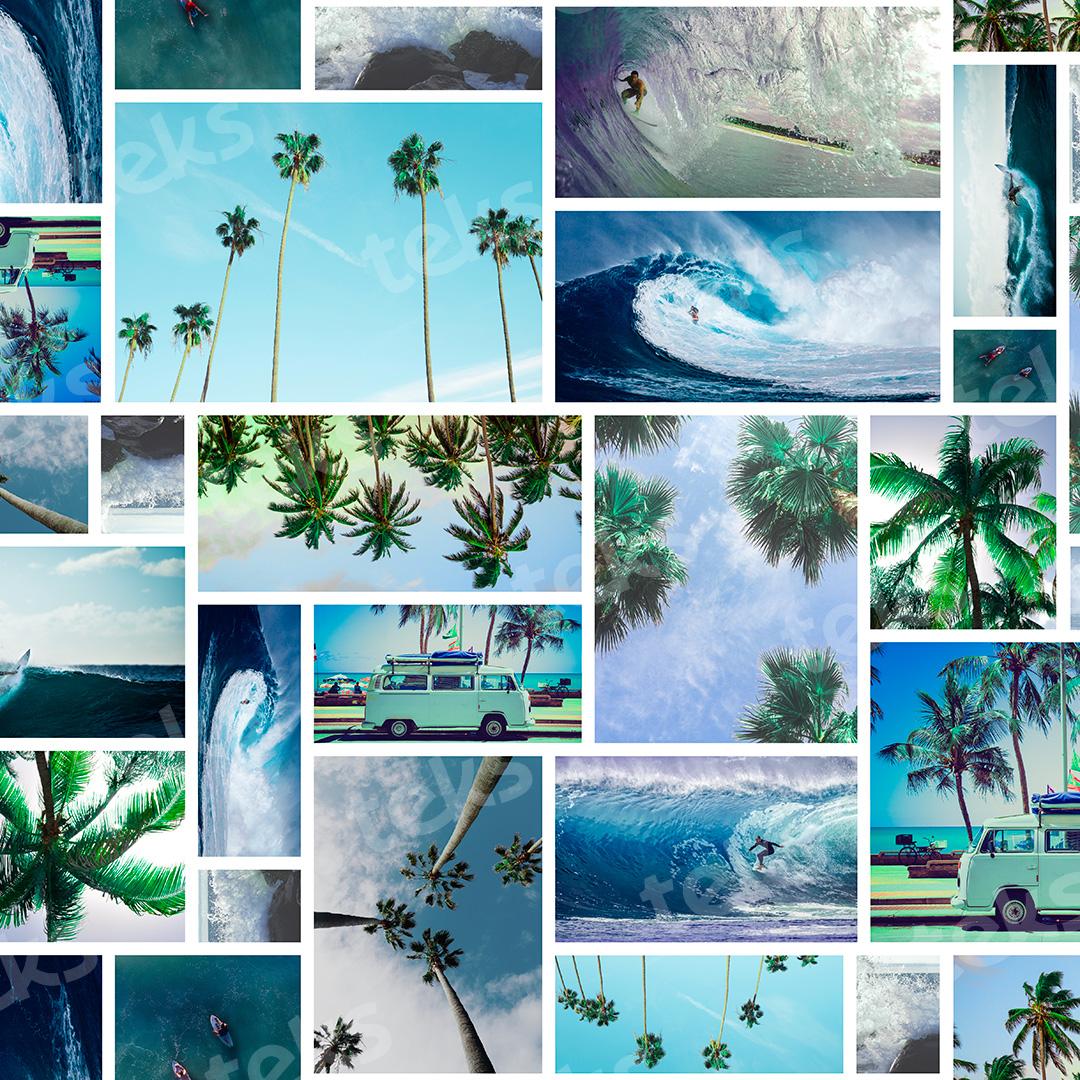 _fotografia_tropical_patchwork_collage de fotos_paisaje_atardecer_mar_olas_palmeras_realismo_surf_viajes_marino